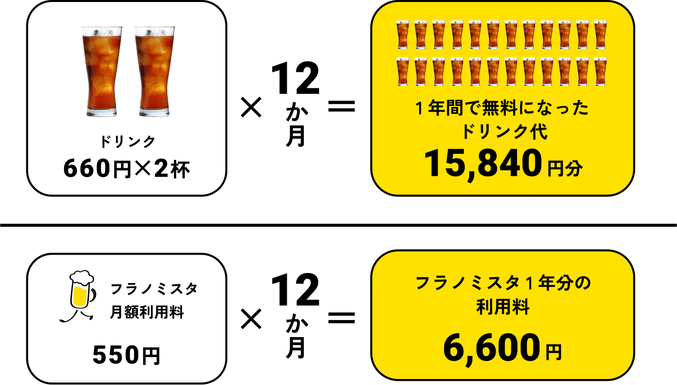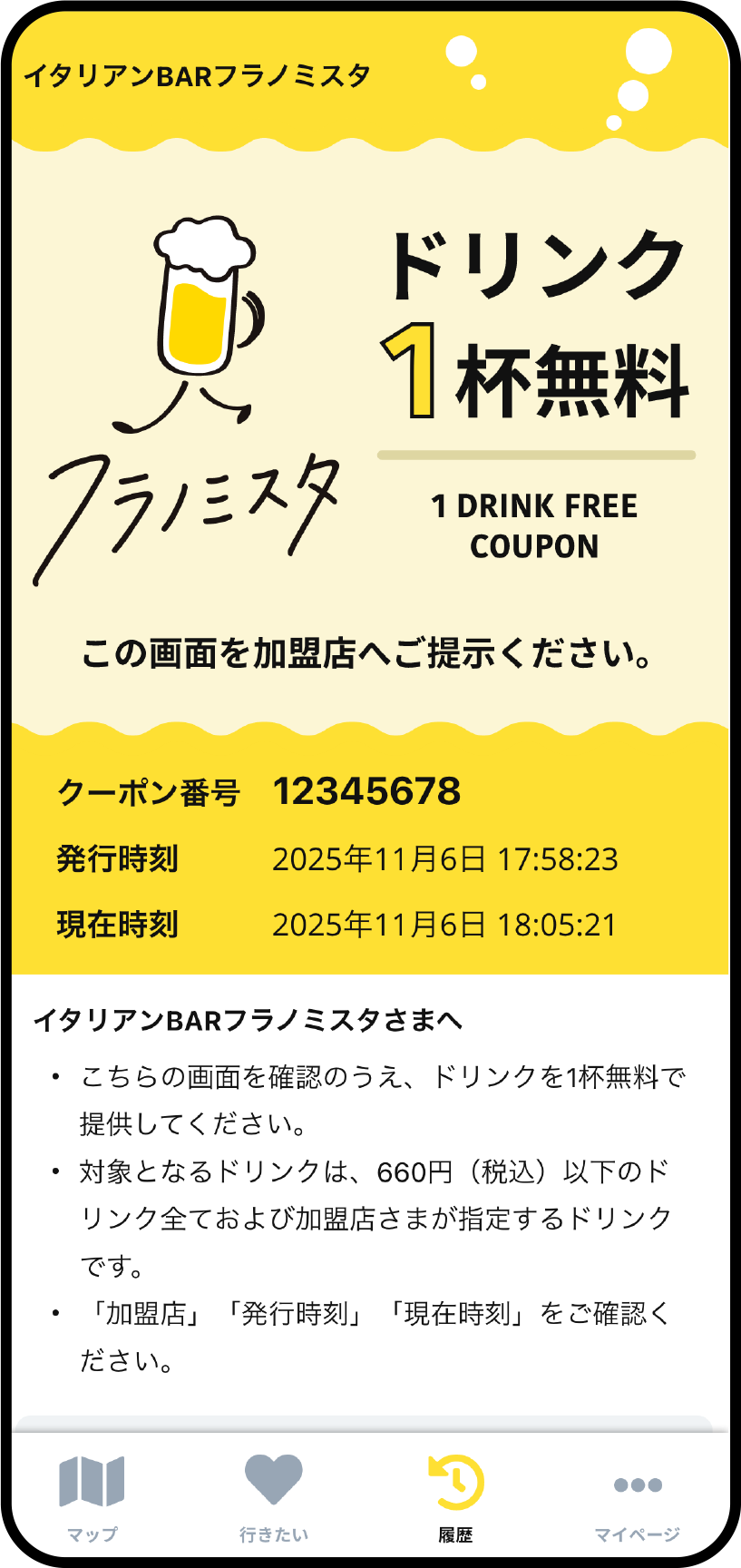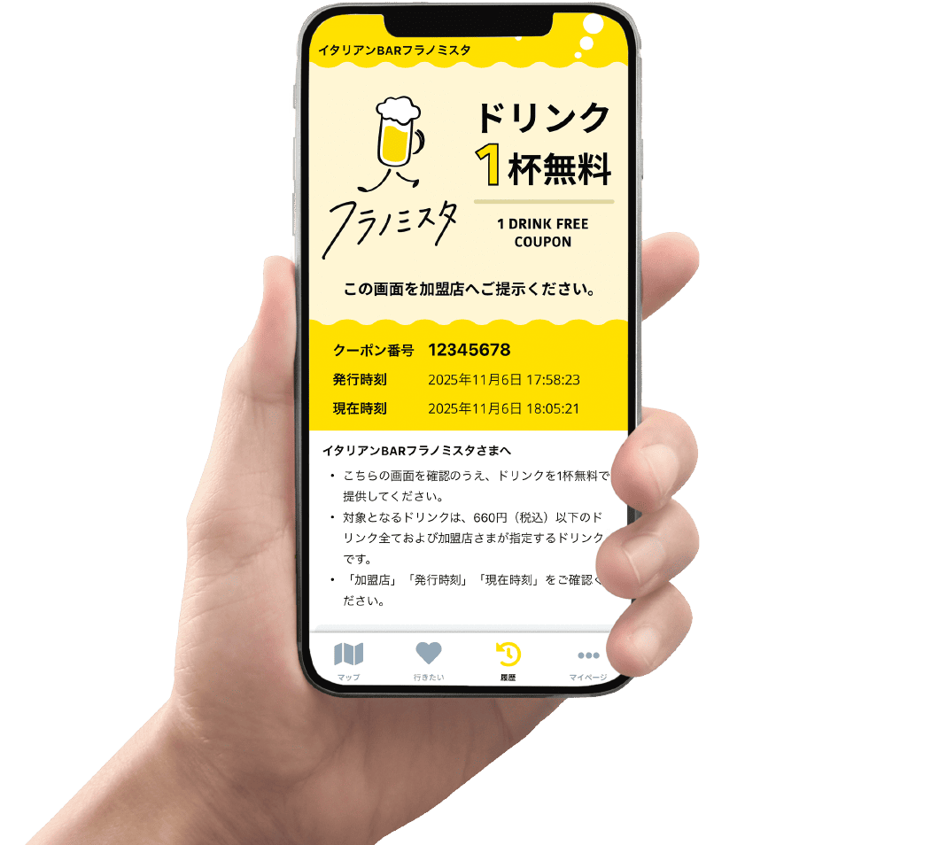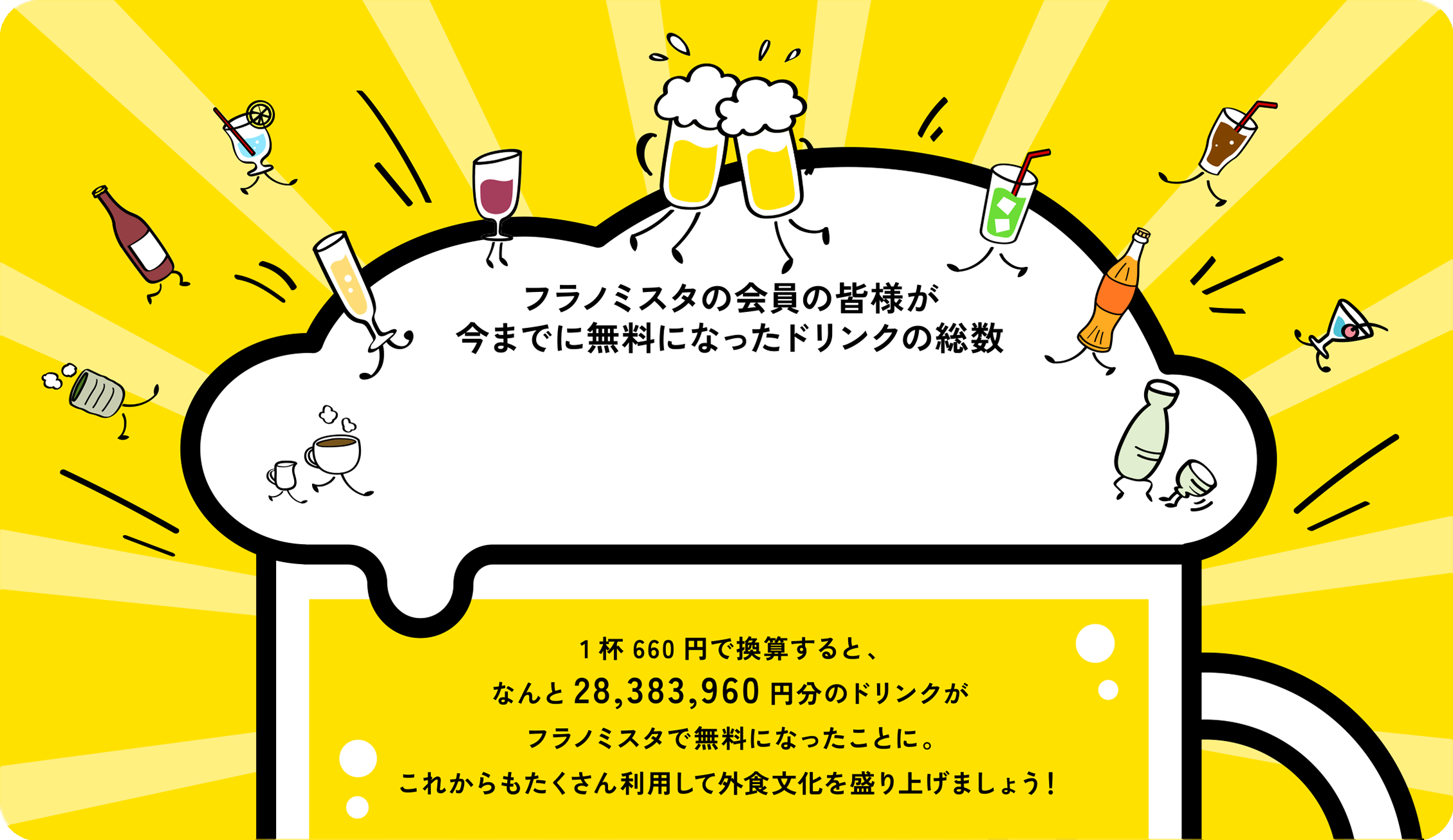 全員がフラノミスタのサービスをご利用いただき、クーポン画面を提示した場合は全員分のドリンクが1杯無料になります。 なお、クーポン利用の条件は「来店者一人当たり1,100円(税込)以上※の会計」(無料対象ドリンクの代金は除く)です。
