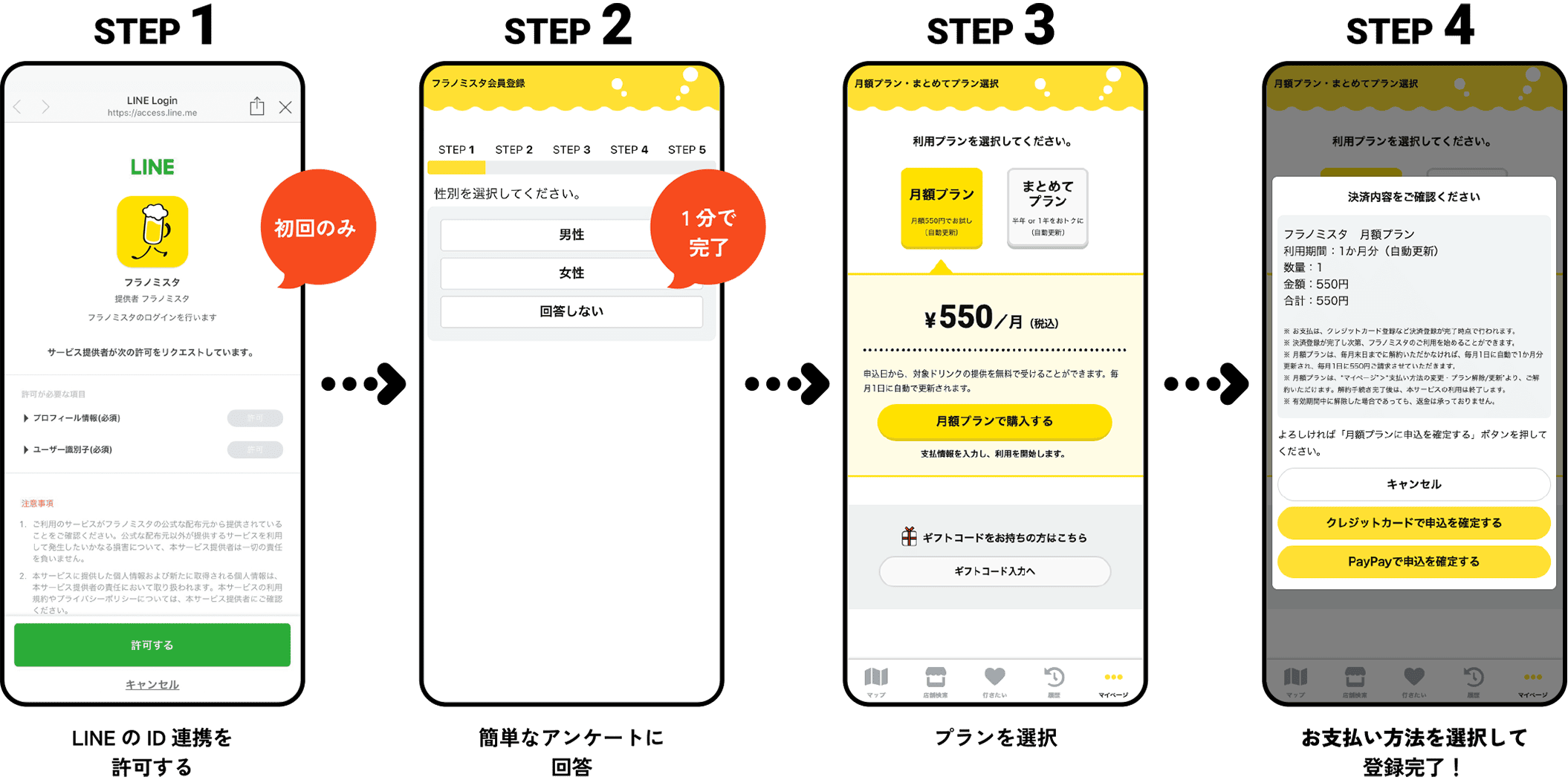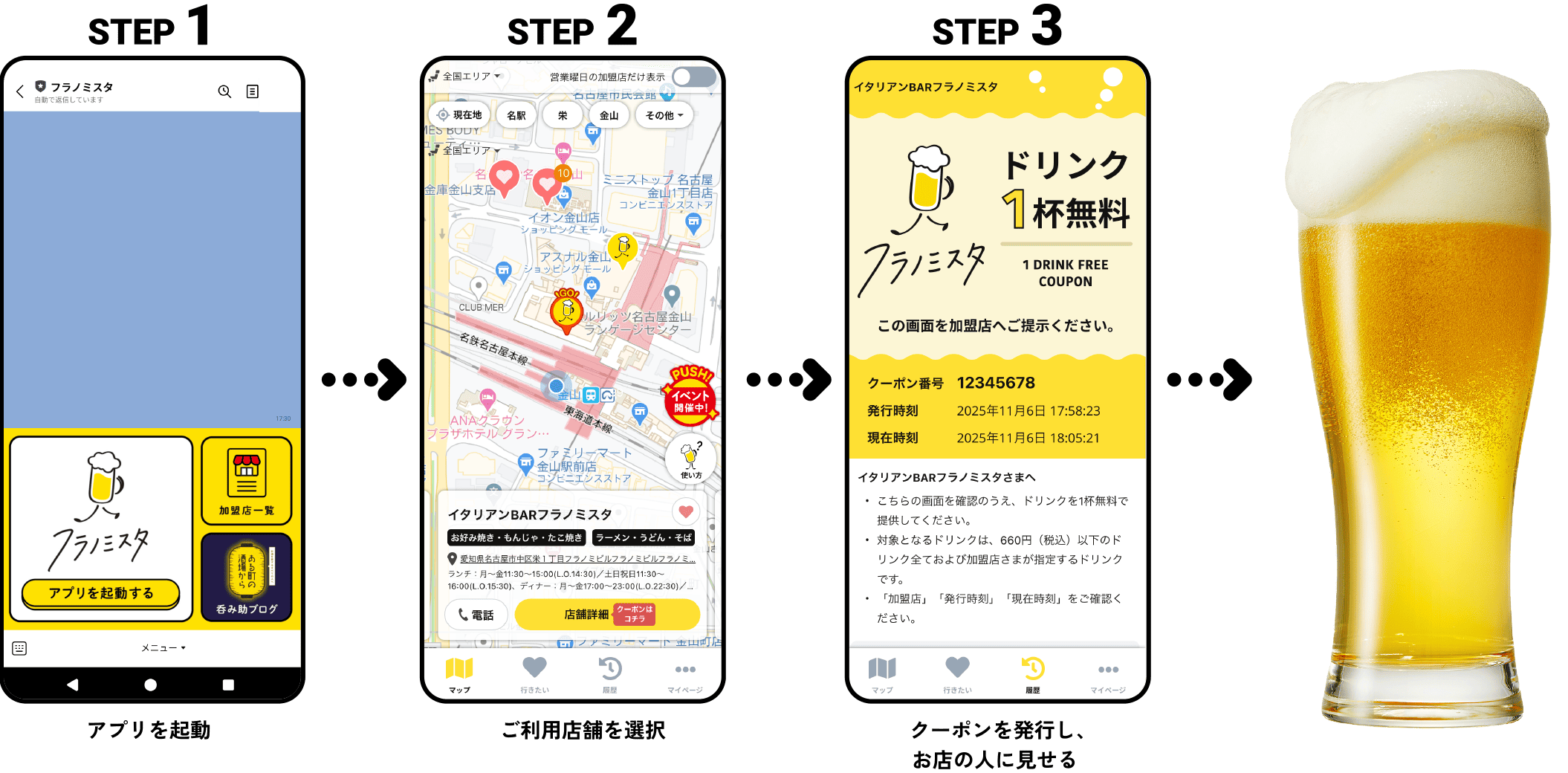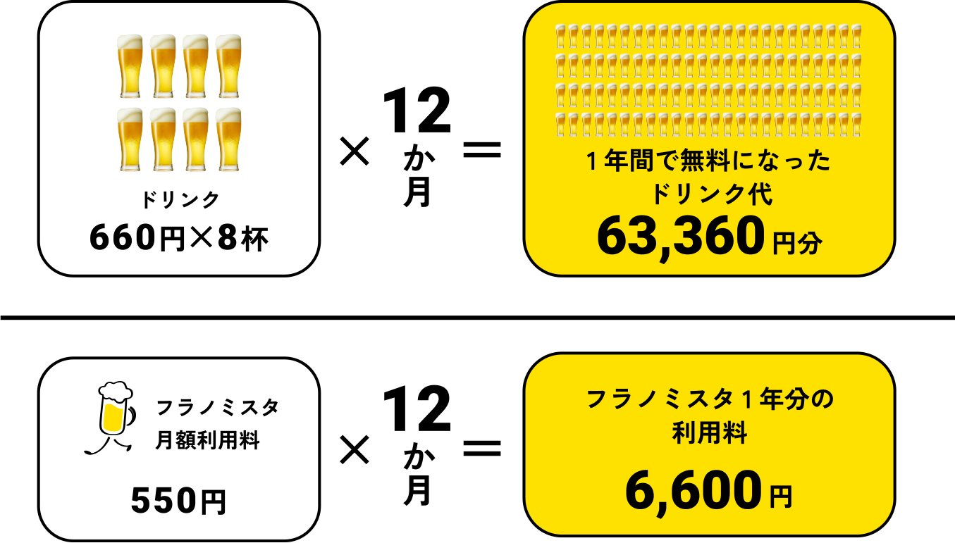 全員がフラノミスタのサービスをご利用いただき、クーポン画面を提示した場合は全員分のドリンクが1杯無料になります。 なお、クーポン利用の条件は「来店者一人当たり1,100円(税込)以上※の会計」(無料対象ドリンクの代金は除く)です。