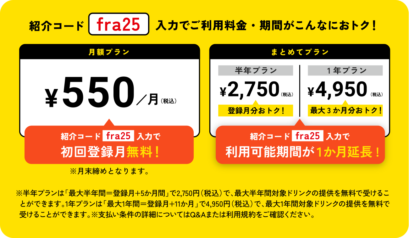 (無料対象ドリンクの代金は除く)などの利用条件がございます。