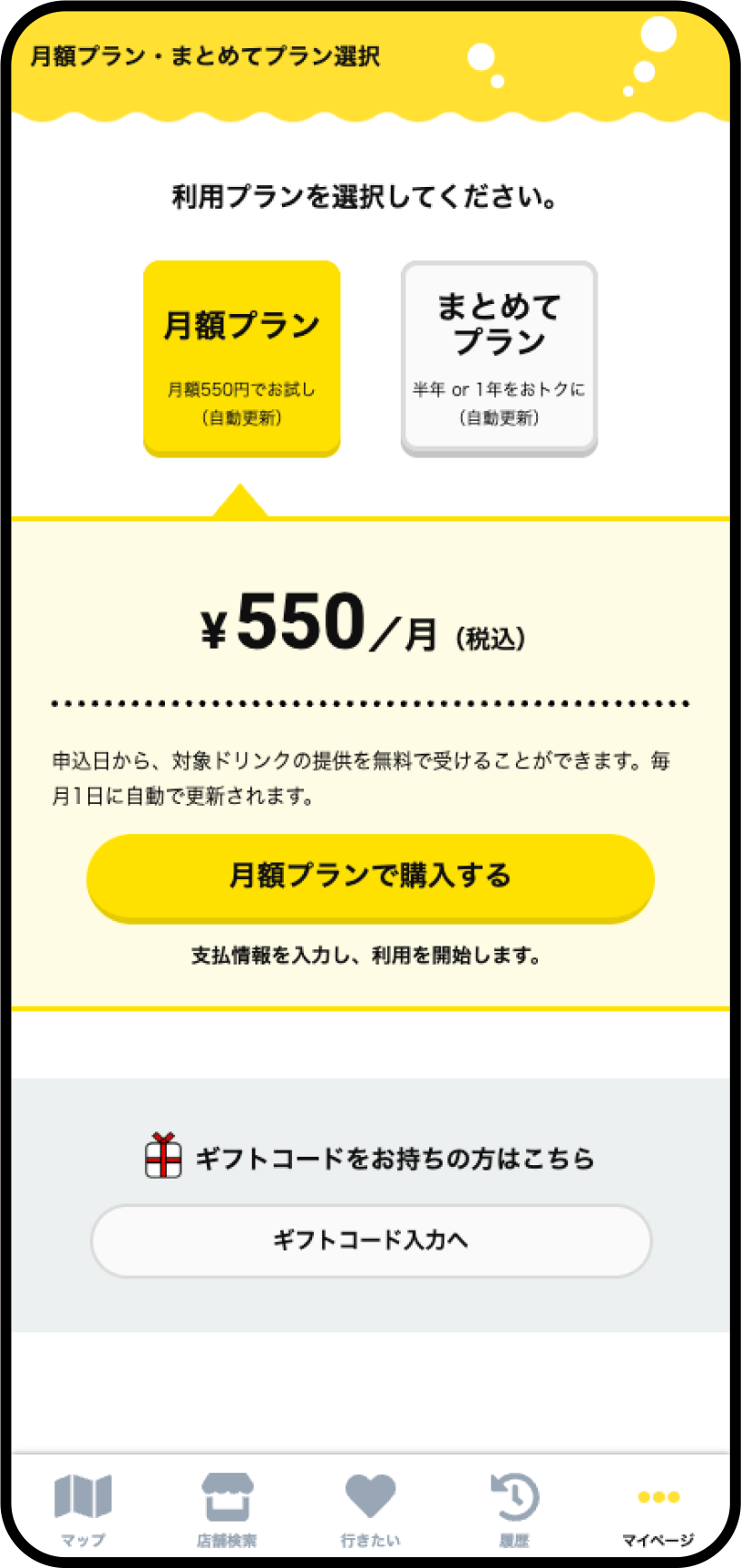 いずれのプランも日割り計算は実施しておりません。月の途中でプラン選択をしても、プラン選択をした日(ギフトコードの入力を含みます。)の属する月の1日からご利用した場合と同様の扱いとなります。ただし、月額プランの場合、無料期間が適用される場合は、それら無料期間が終了した翌月1日が課金日となります。